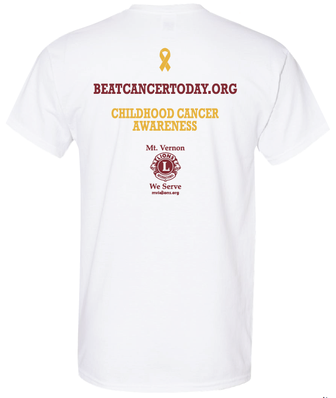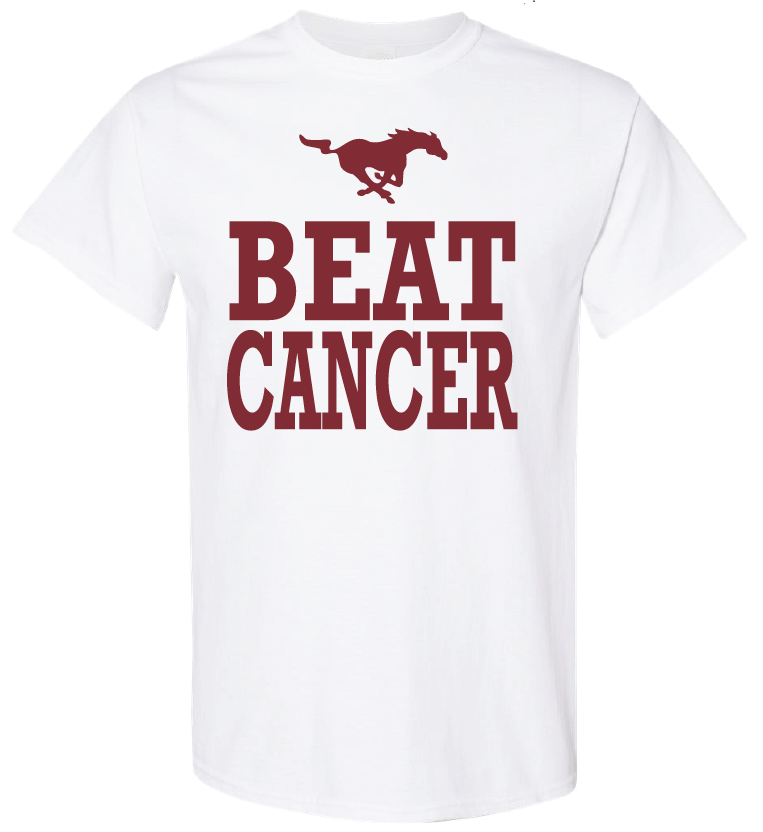 Go Mt. Vernon Mustangs! Our Beat Cancer shirt in Mt. Vernon colors! This is our second run of Mt. Vernon shirts and now the colors are reversed to be white shirts with maroon and gold font!